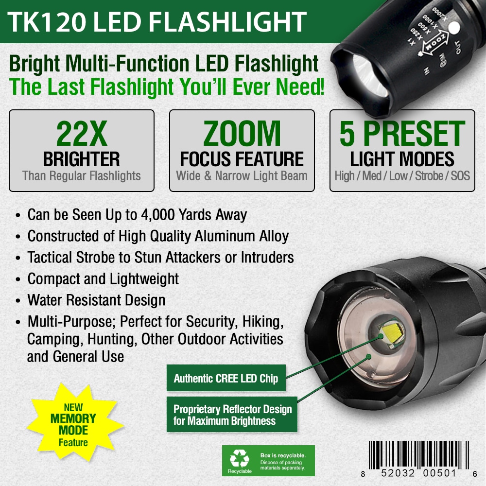 Adjustable Focus Zoom An important feature of the TK120 LED Tactical Flashlight is the adjustable focus zoom lens. The zoom feature allows the user to focus the light beam to enhance light on a targeted area. This feature is useful when a narrower beam is needed in order to see something specific from a long distance. For example, a security guard approaching a potentially dangerous situation, or a hunter moving up on an animal would find this particularly useful. 5 Light Modes Five Light Mode OptionsThe TK120 Flashlight offers five different light modes which include High, Medium, Low, Strobe and SOS.  Changing to a different light mode is as simple as a quick-click on the tail-cap button. The multiple light modes are designed to accommodate you in nearly any situation.